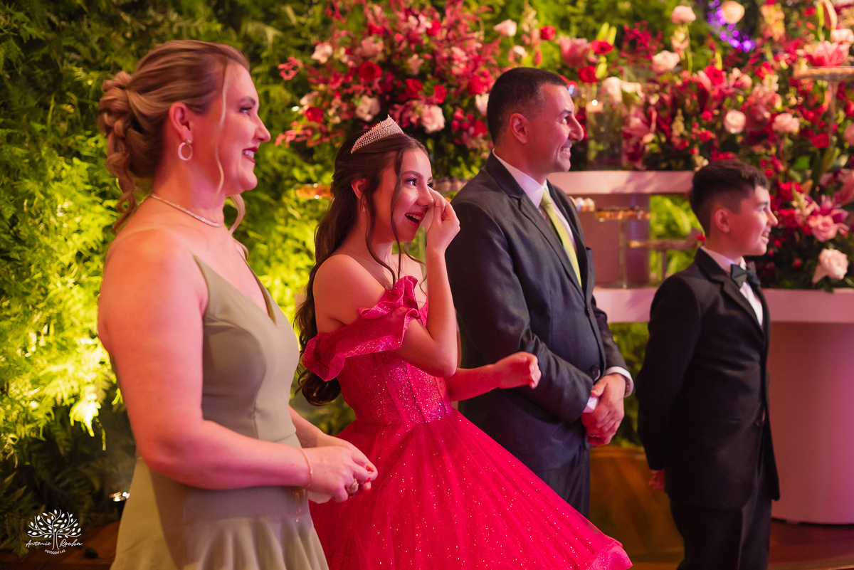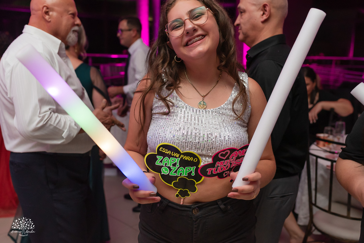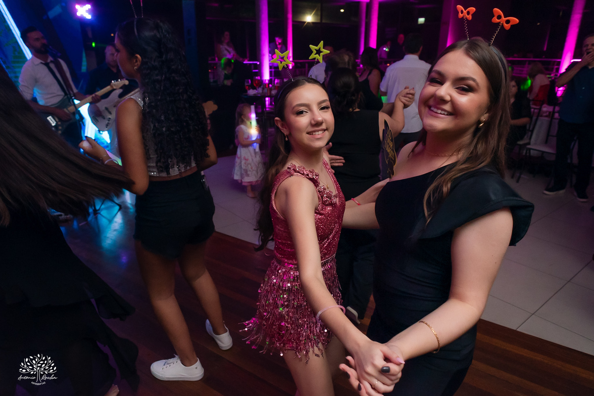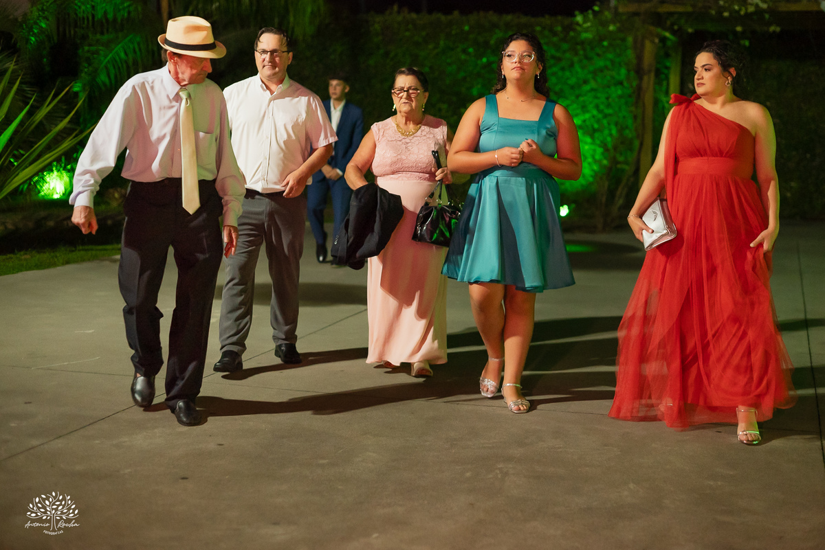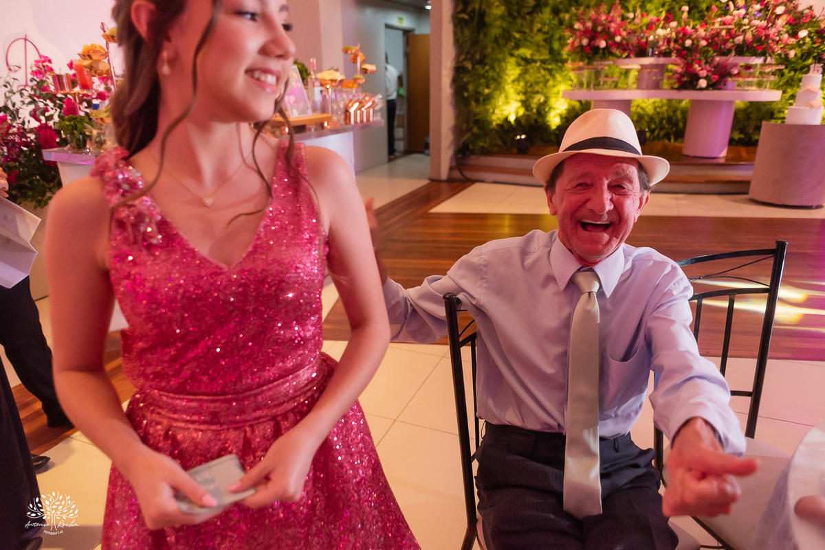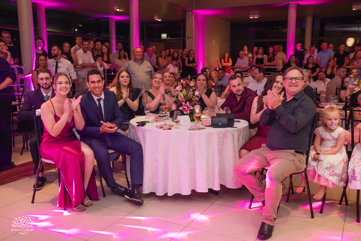 Ao chegar no salão, ficou claro que a noite seria inesquecível. A recepção calorosa, os abraços apertados e os amigos que caminham junto com essa família ao longo da vida da Diulya criaram uma atmosfera única. Era um ambiente onde o amor e a conexão estavam presentes em cada encontro, em cada sorriso.