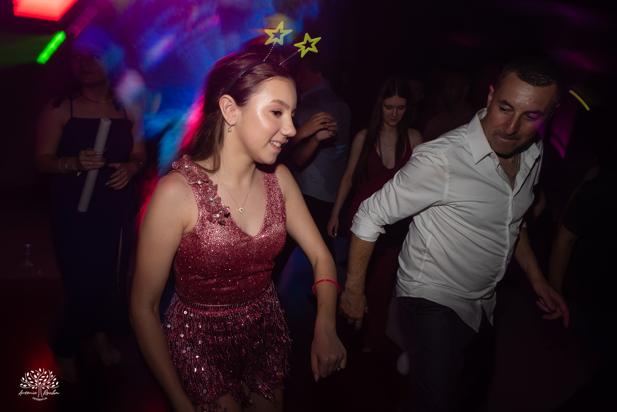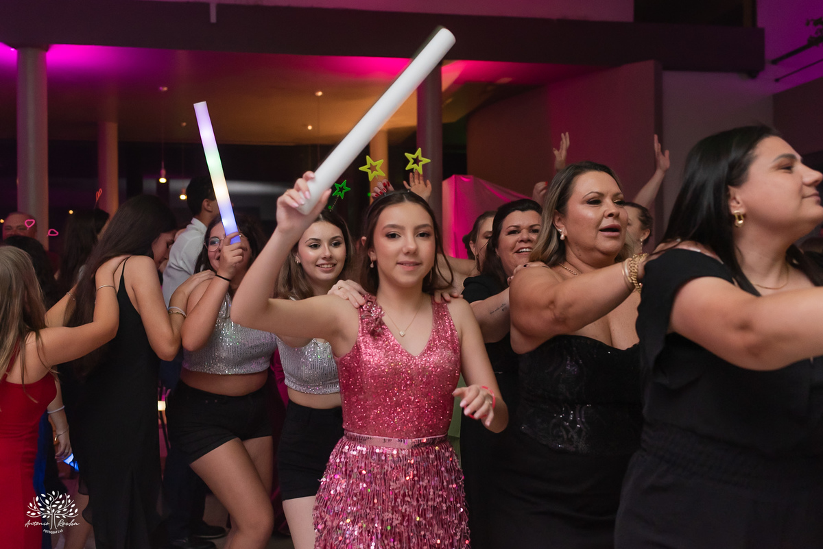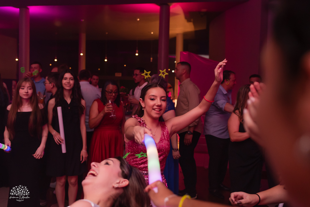 A festa ganhou ainda mais energia com a animação contagiante, o bar de drinks sempre movimentado e a tão esperada entrada da Diulya, que marcou um dos grandes momentos da noite. Vieram então as danças: com o pai, com o irmão, a valsa com os dindos — instantes que emocionaram e prepararam o clima para o parabéns.