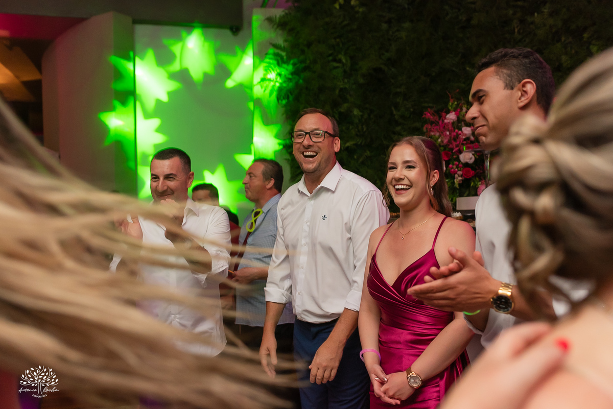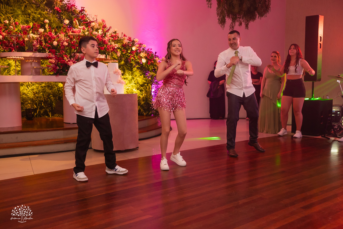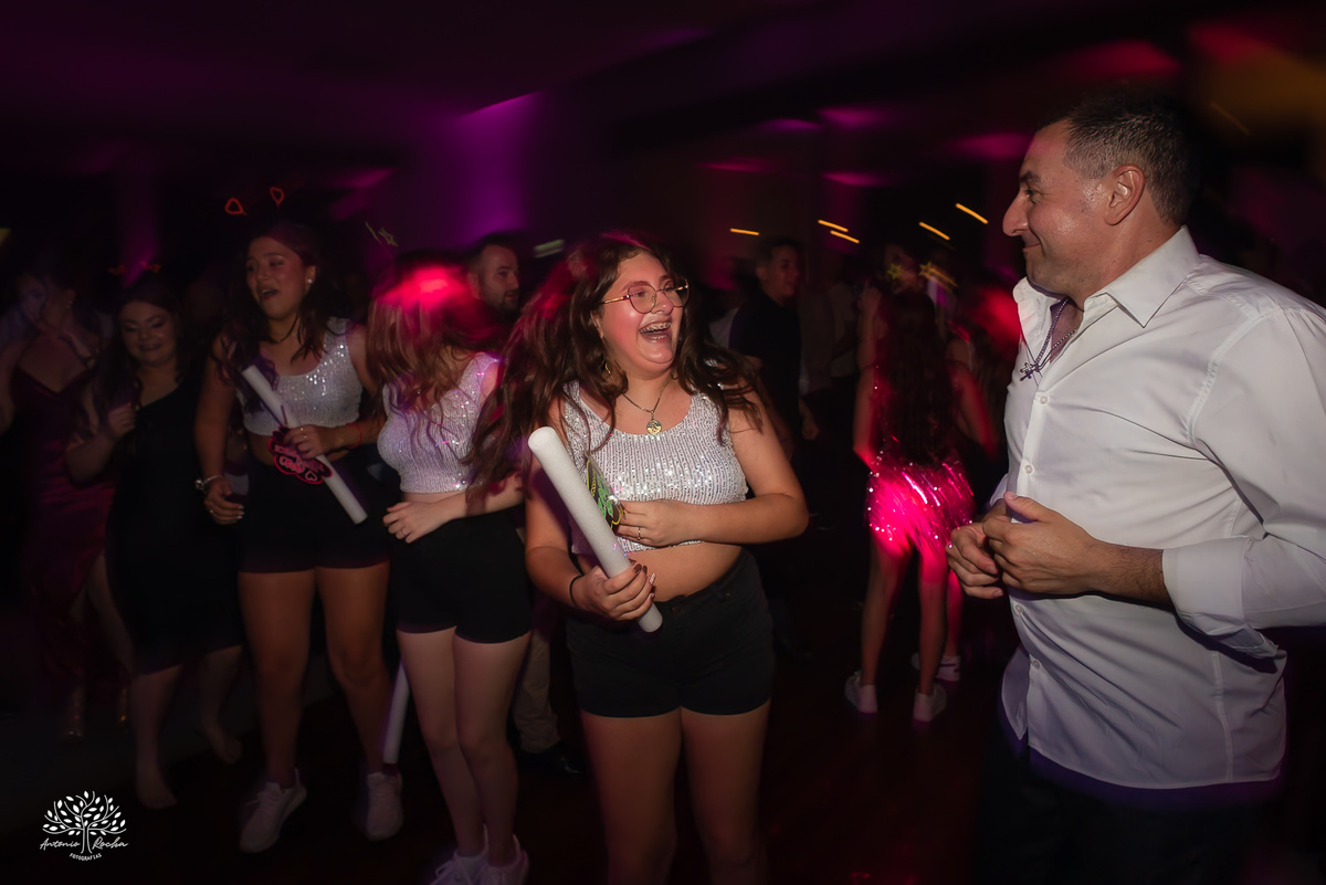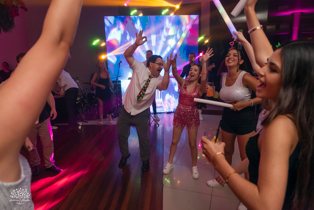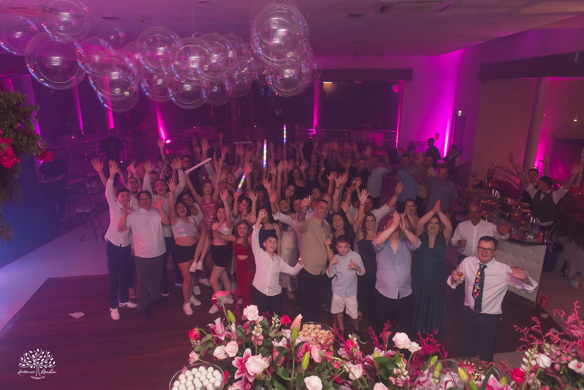 A abertura da pista de dança foi simplesmente incrível. Ao lado das amigas, da mãe, do irmão e do pai, Diulya deu início a uma celebração intensa, daquelas que a gente sabe que vão até o amanhecer. E foi exatamente assim: pista cheia o tempo todo, energia lá em cima e uma alegria que só essa família sabe transmitir. Celebramos até as 5h da manhã.